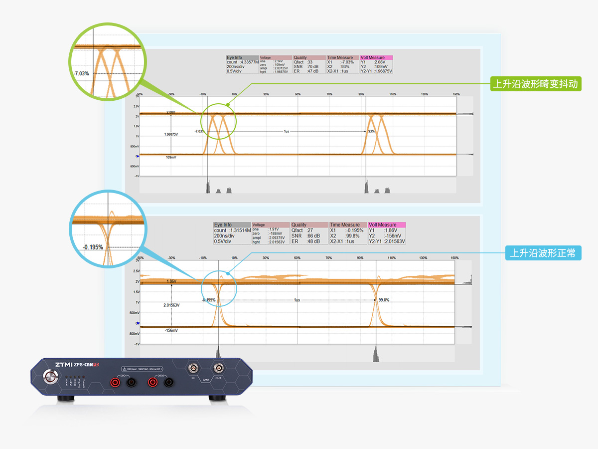 ZPS-CAN FD總線分析儀從幅值、擾動和斜率等多種維度參數進行CANFD總線信號質量分析評估, 可直觀查看總線信號質量情況,規避信號傳輸失敗風險。