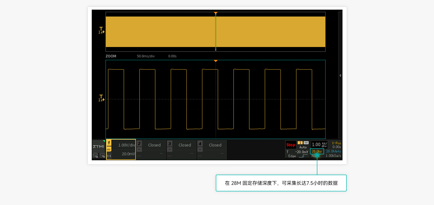 只有存儲深度足夠,示波器的采樣率才能充分發揮,觀察到的波形也更加真實、細膩。ZDS1104示波器標配28M存儲深度,您可以在1K采樣率下輕松觀測7.5小時的波形!