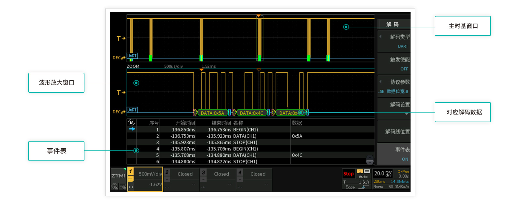 協議信號調試不只要關注波形質量,更要關注波形對應數據,而協議解碼功能往往作為示波器的付費選配功能。ZDS1000示波器基于客戶需求免費標配了UART、 SPI、 IIC、 CAN、CAN-FD、LIN、FlexRay、USB、 PS/2、 DALI、 Wiegand、 1-Wire、DS18B20、 HDQ、 SD_SPI、 SD_SD、 Manchester、Diff-Manche、 Miller、 DHT11、 SHT11 共21種協議解碼,協議調試信手拈來。