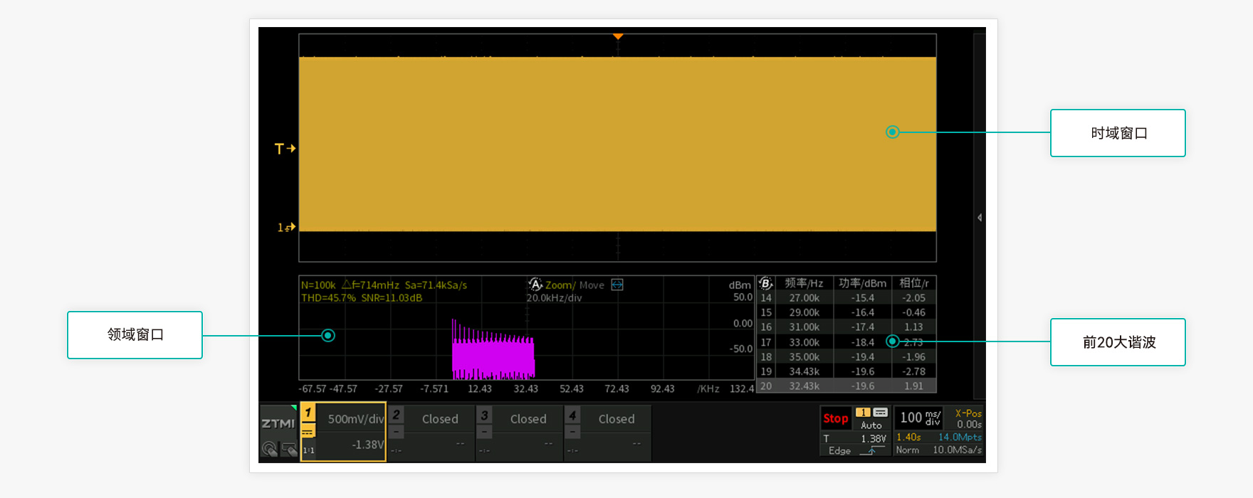 FFT功能在定位電路中的干擾噪聲來源尤為重要,但離開了充足的FFT分析頻點支持,FFT的分析結果往往毫無意義。ZDS1104示波器首次將基礎型示波器的FFT分析點數提升為100K,在1G采樣率的情況下,頻譜分辨率仍能精確到10KHz。
