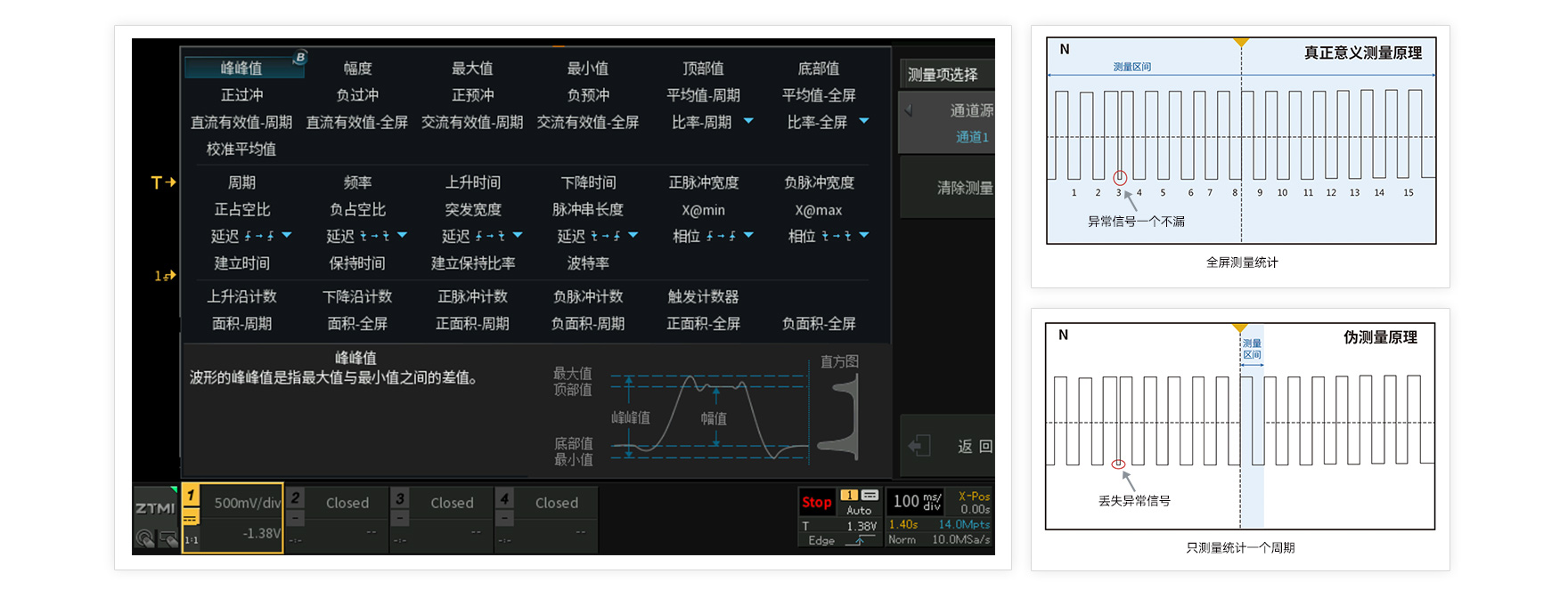 不同于傳統示波器只測一個周期,或通過抽樣減少數據量再測量的模式,ZDS1104示波器通過FPGA全硬件并行處理,基于原始采樣率和28Mpts全存儲深度,對每一幀波形每一周期進行測量統計,測試項目可達50余種,并且支持8種參數同時顯示。