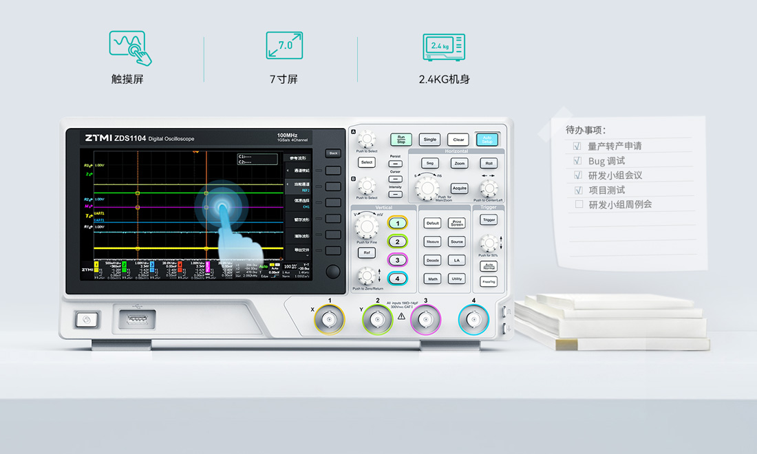 在精致的7寸屏機身之上,你可以通過觸摸屏輕松進行波形操控,同時2.4Kg的輕盈機身讓示波器可以如筆記本電腦般無所不在,這給多樣化的應用場景創造了多種可能。