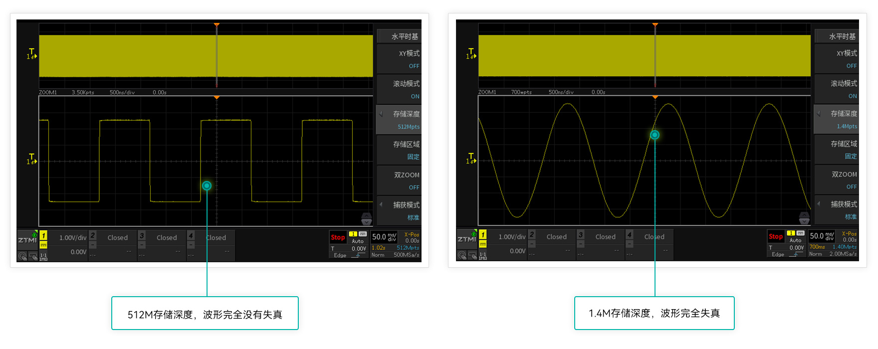 存儲深度等于采樣率乘以采樣時間,512M大存儲深度,長時間捕獲波形,依然不會出現(xiàn)波形失真。