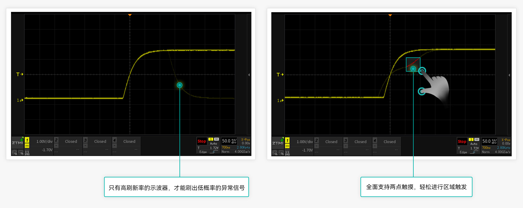 波形刷新率越高,死區(qū)時間就越短。ZDS4000系列示波器,標配1M次波形刷新率,配合模板觸發(fā),讓您最大概率的發(fā)現(xiàn)并捕獲異常信號。