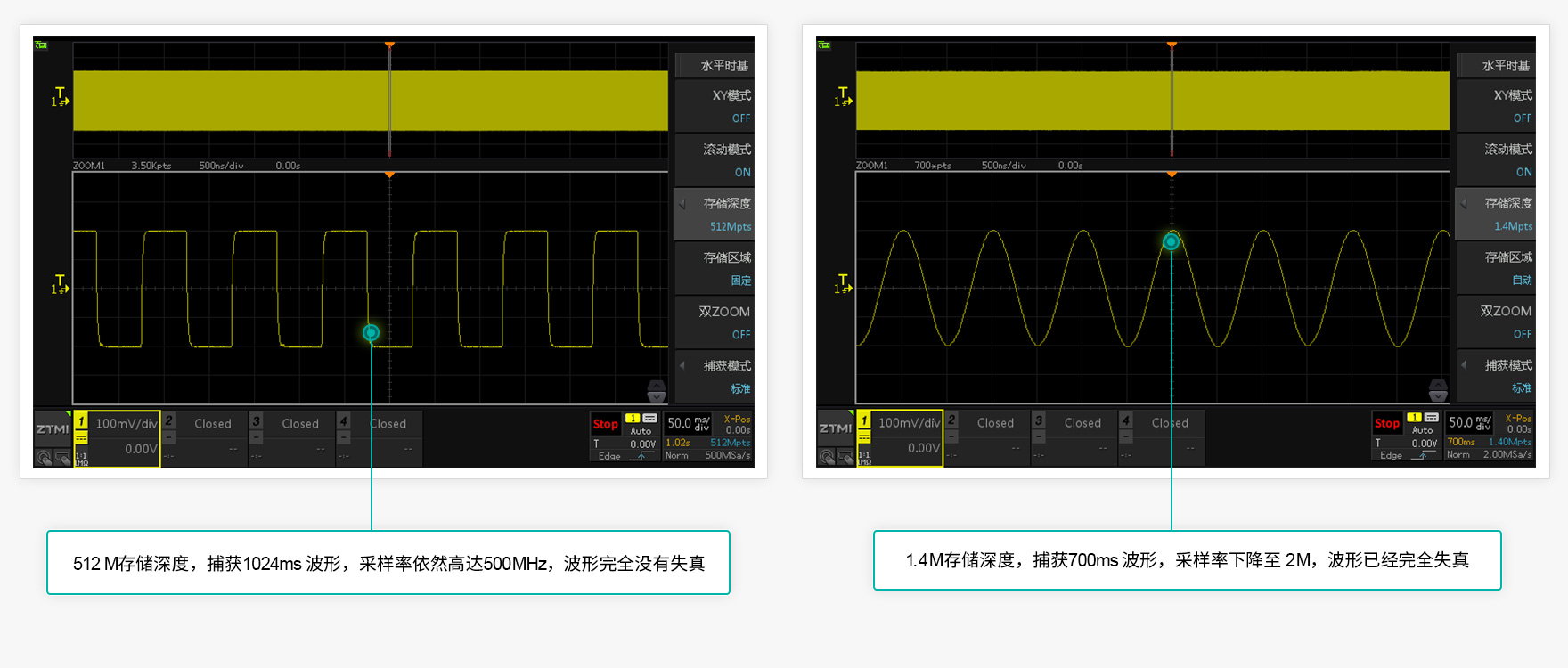 如果存儲深度不足,高采樣率的情況下只能捕獲一小段波形,ZDS5054D標配512Mpts超大存儲深度,捕獲1024ms波形的情況下,依然可以保持100MSa/s采樣率。