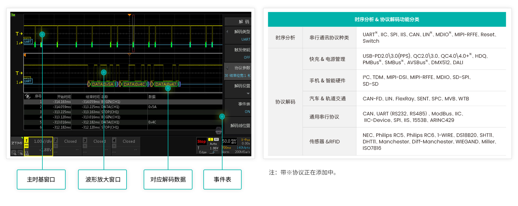 ZDS5054Pro、ZD5054D顛覆性地標配45種串行通信協議解碼,涵蓋常用的現場總線、系統總線以及內部總線。3秒鐘即可完成512Mpts波形解碼,協助工程師快速完成通信調試。