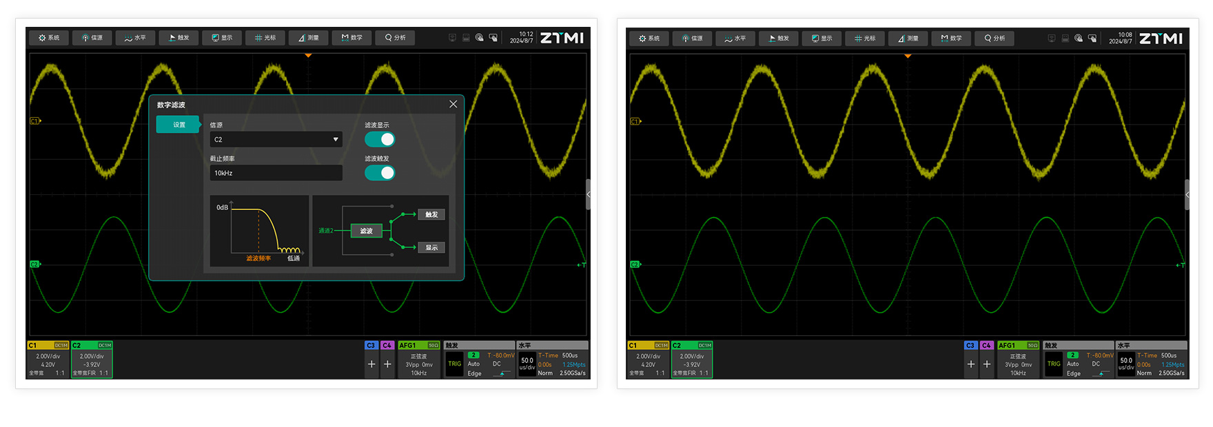 ZUS5000示波器內置FIR硬件實時濾波器,可在10Hz-500MHz范圍內任意調節示波器帶寬,精準過濾特定頻點的噪聲與干擾信號,用更專業的手段讓工程師看到更真實的波形信號。