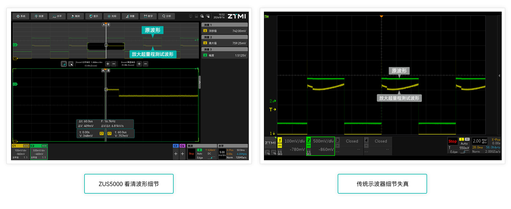 500Mpts存儲深度,捕獲長時間波形不失真
