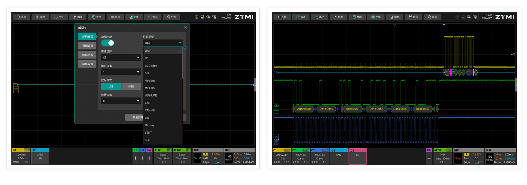 ZUS5000示波器提供了最多超40種串行通信協議解碼,并支持雙線解碼功能,可以實現同一時刻,不同協議的同時解析,這一實用功能將大大提升了工程師面向協議分析的效率。