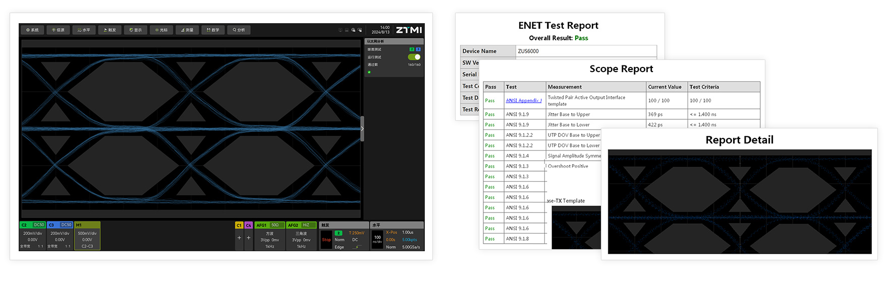 ZUS6000支持百兆以太網(wǎng)分析軟件,能夠自動測試以太網(wǎng)100Base-TX標準的信號特性,并在短時間內(nèi)完成信號眼圖,傳輸特性分析,并與標準協(xié)議參數(shù)做對比,給出信號測試結(jié)果( Pass/Fail ),并支持完整測試報告的導(dǎo)出。