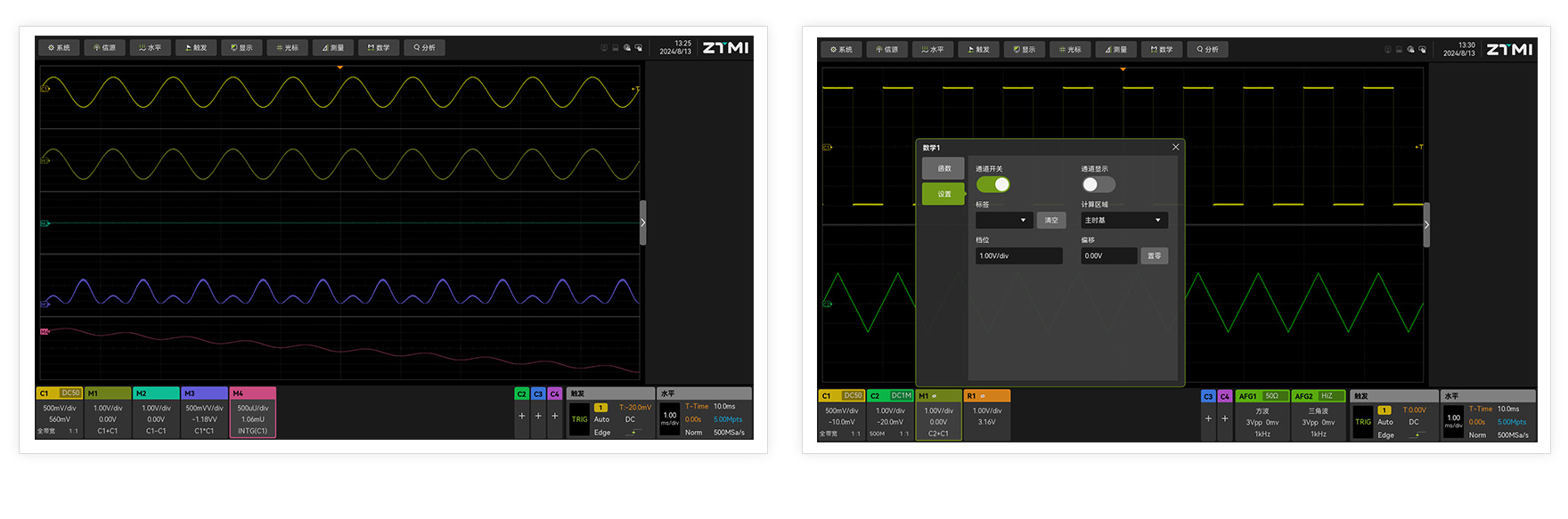ZUS6000支持同時增加多達4個不同公式的波形運算,不同運算結(jié)果可以顯示在不同的波形窗口,讓工程師看到更多的視角和細節(jié)。運算通道可以選擇顯示與隱藏,同時不影響運算的正常進行,操作靈活,滿足更多場合需求。