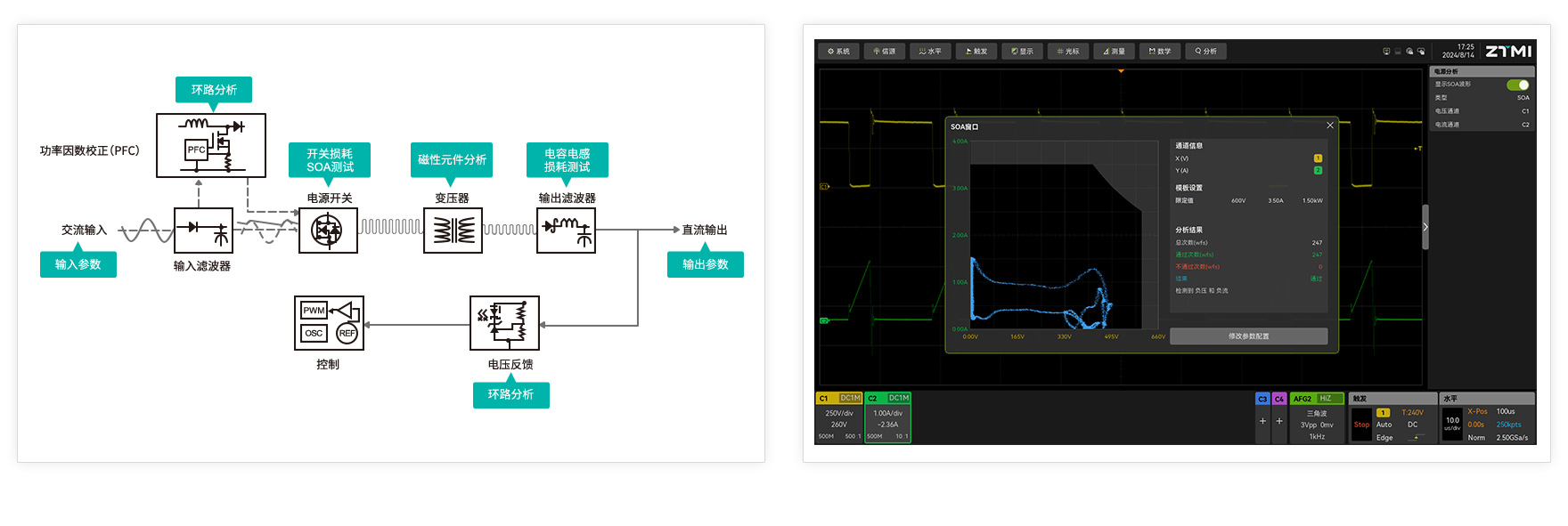 ZUS6000提供的電源分析功能涵蓋了輸入輸出特性測試,MOSFET、磁性元件、電容、電感等器件分析,調(diào)制波形測試,可以全方位評測電源產(chǎn)品的可靠性。