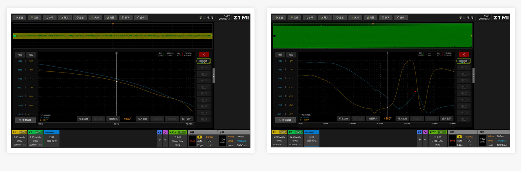 穩(wěn)定的反饋環(huán)路對開關(guān)電源來說是非常重要的,伯德圖可以直觀呈現(xiàn)負反饋系統(tǒng)的增益、相位的頻率響應(yīng)曲線,進而可以判斷控制系統(tǒng)是否穩(wěn)定。電源紋波抑制比(PSRR)也是電源重要的性能參數(shù),評估電源電壓發(fā)生變化時,對輸出的電壓影響大小,ZUS6000提供的環(huán)路分析功能,配合信號注入器可以實現(xiàn)PSRR的快速測試。