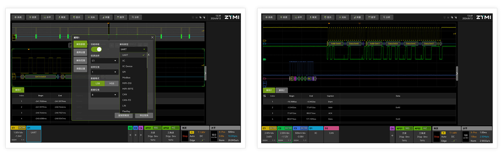 ZUS6000不僅延續(xù)了致遠儀器免費協(xié)議解碼的傳統(tǒng),提供了40余種串行通信協(xié)議解碼,還創(chuàng)新性的支持了雙解碼功能,可以實現(xiàn)同一時刻,不同協(xié)議同時解析,這一實用功能將大大提升了工程師做協(xié)議分析的效率。