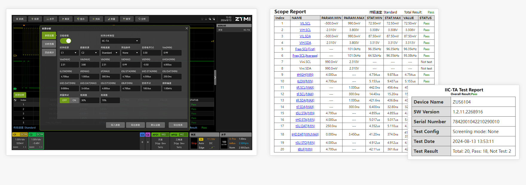 手機、智能穿戴、家電、多媒體影音、汽車電子配件等智能設(shè)備,對于內(nèi)部總線通信時序一致性有嚴格要求。ZUS6000創(chuàng)新的時序分析功能,可分析IIC、IIS、SPI、MIPI-RFFE等信號的脈寬、幅值、邊沿、建立時間、保持時間等參數(shù),并導(dǎo)出測試一致性報告。
