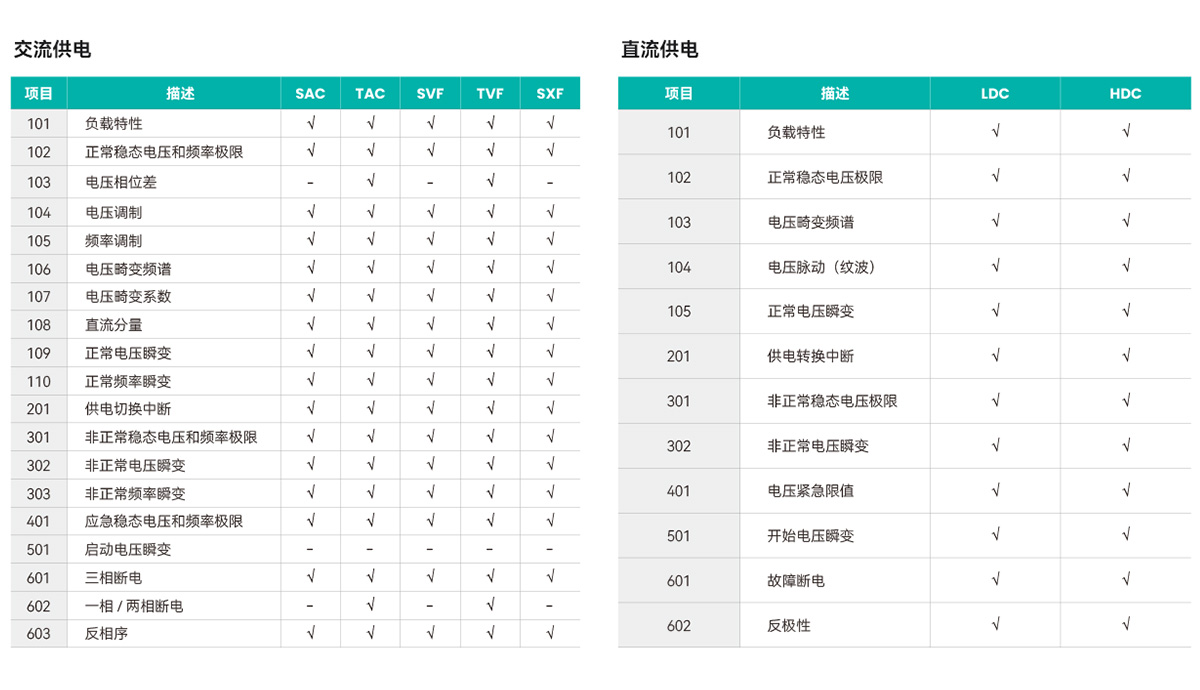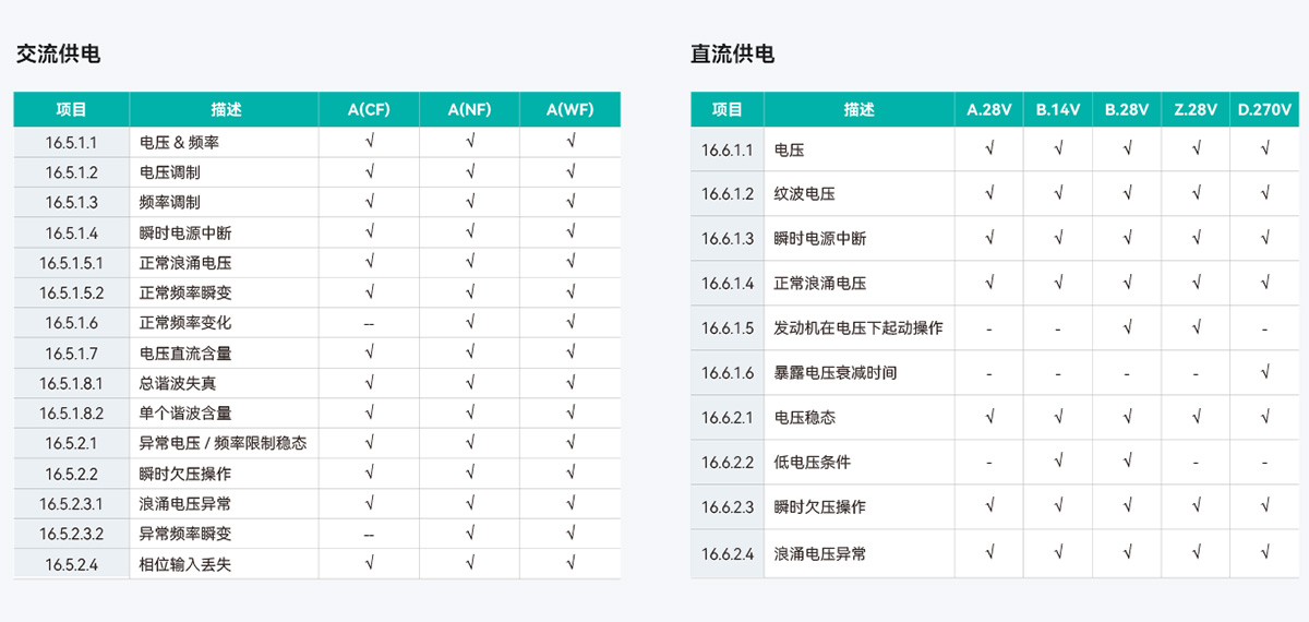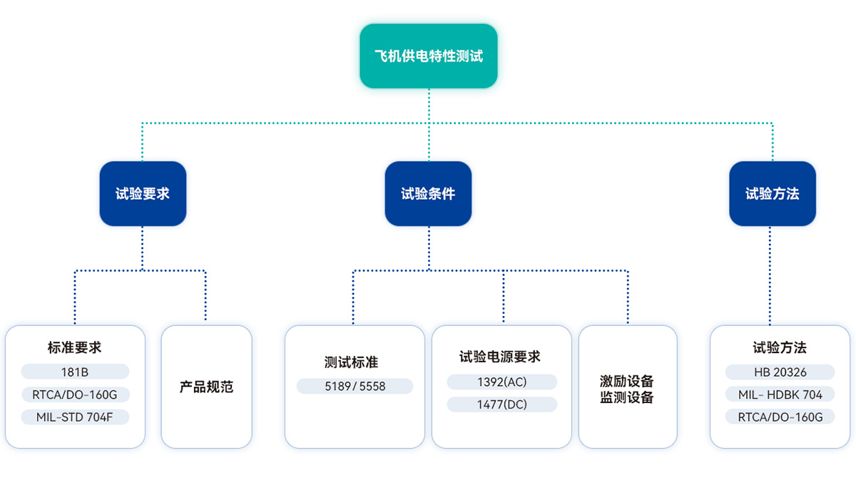 飛機供電特性測試是指各類機載用電設備在各種供電狀態下的性能以及其對供電系統影響的測試和驗證,是保證用電設備(尤其是大功率電子設備)與飛機供電系統相兼容的重要措施和方法,其試驗要求、試驗條件、試驗方法如下圖所示。