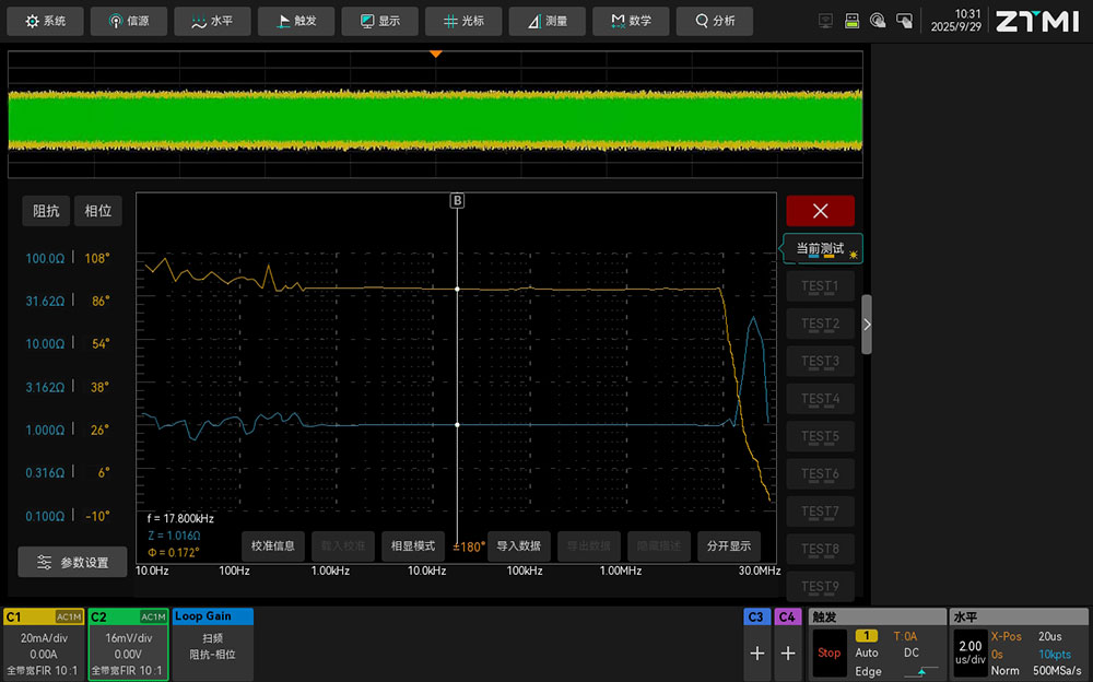 致遠儀器ZUS5054示波器內置30MHz高性能信號發生器與環路分析(Bode Plot)功能,可實現諧振點測試的全自動化流程。