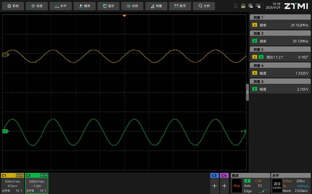 當需要獲取更高精度數據,或諧振頻率超出30MHz自動測試范圍時,ZUS5054示波器的雙通道高精度相位測量功能可實現諧振點的精準定位。