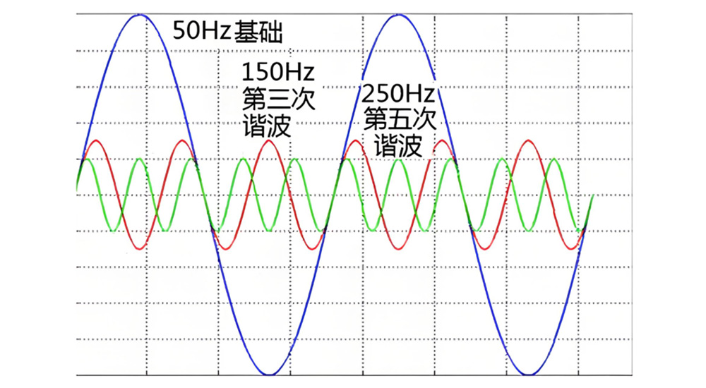 諧波是指電流中所含有的頻率為基波頻率整數(shù)倍的分量。如果把電力系統(tǒng)中的基波電流比作一首樂曲的主旋律,那么諧波就是這首樂曲中不和諧的雜音。在我國,電網的標準頻率是50Hz,那么2次諧波就是100Hz,3次諧波是150Hz,以此類推,如下圖所示。