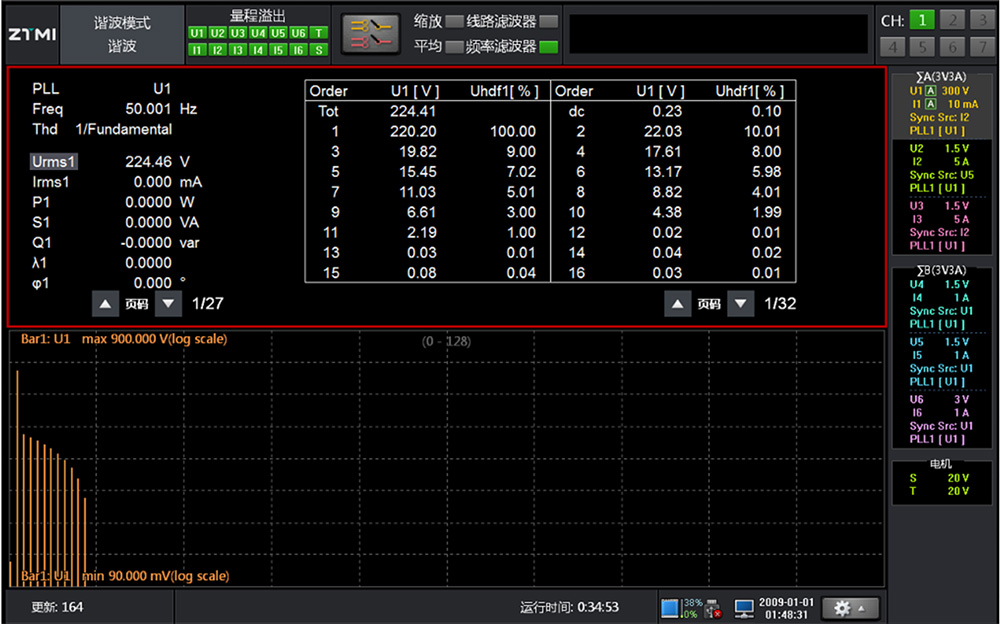 諧波測量: 在該測量模式下,可對1kHz基波頻率信號進行多達255次的諧波測量,擁有PLL源進行校準,對基波頻率高于商用電源頻率的信號進行諧波測量時,須使用該模式,如圖所示,為諧波測試;
