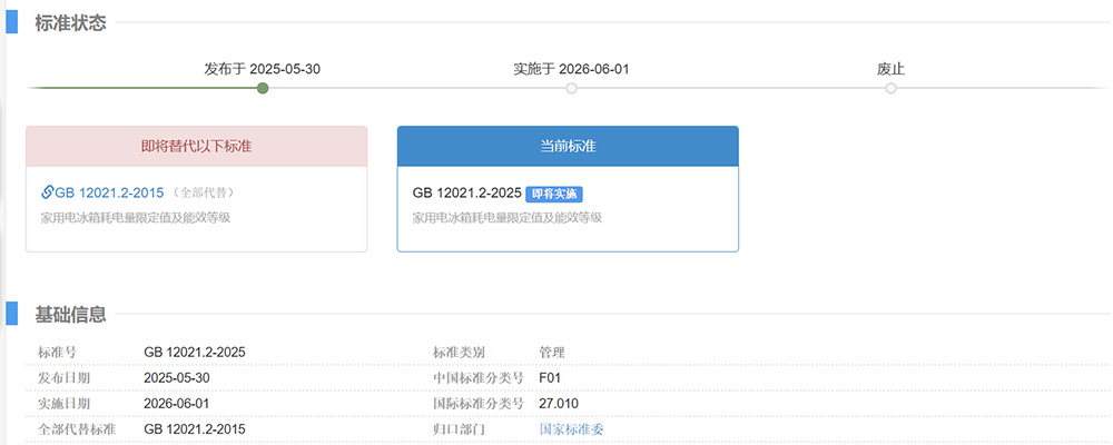 新版GB 12021.2-2025《家用電冰箱耗電量限定值及能效等級》,將于2026年6月1日起正式實施。新標準對能效等級體系進行了全面優化,在保持5級分類框架的基礎上,大幅提升各等級能效要求,并引入了更為科學的判定方法。這一變革將重塑冰箱能效評價體系,對整個行業產生深遠影響。