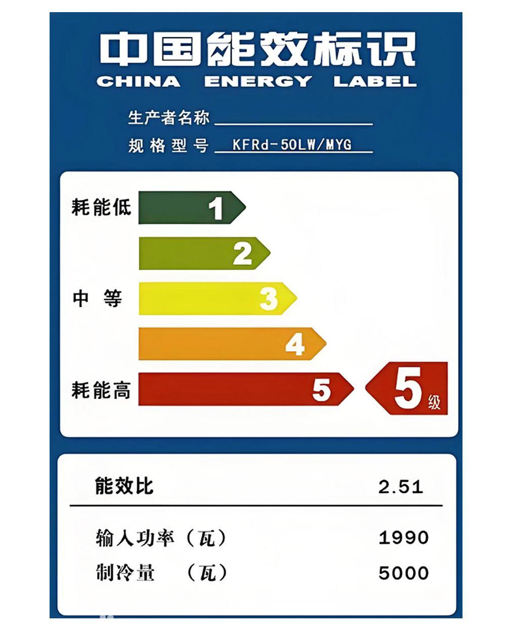 5級:市場準入門檻,低于該等級要求的產品不允許生產和銷售,(能效比2.50-2.79)。
