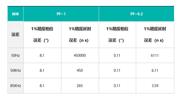 我們可以發現,頻率相同情況下,功率因數越低,延時誤差要求越高;功率因數相同的情況下,頻率越高,延時誤差要求越高。如85KHz情況下,功率因數為0.2時,1%精度的延時誤差為3.59ns,而我們常用的電流傳感器在測試85KHz信號時,原邊信號與副邊信號相位差可能都大于3.59ns,所以測試設備必須具備相位校準功能,否則根本無法準確測試無線端的功率和效率。