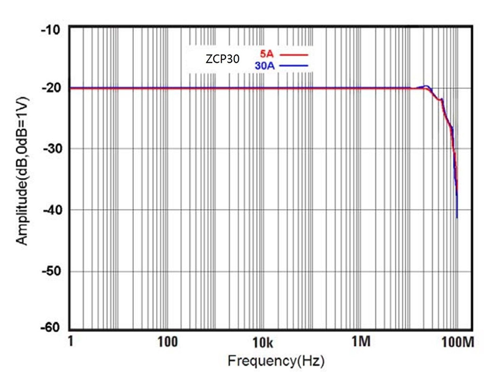 ZUS6000示波器測試無線功率時,主要的偏移誤差來自于探頭。探頭包括差分探頭和電流探頭兩類。如致遠ZP1500D差分探頭和ZCP30探頭,從兩款探頭參數可以看到,ZP1500D帶寬為100MHz,ZCP30帶寬為50MHz。而目前無線充電常用到的信號頻率為幾十KHz到幾MHz范圍,其頻率大大小于探頭本身帶寬。而從探頭本身的幅頻特性來看如圖2所示,探頭測試的信號要在10MHz以上才開始出現衰減。因此針對無線充電信號,探頭本身不會產生衰減及明顯的角度誤差。