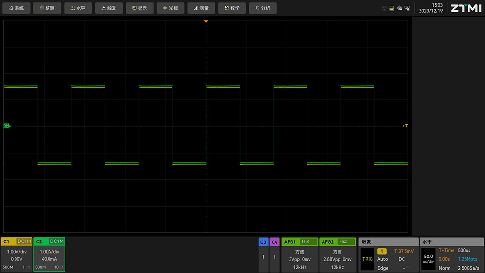 除以上手動校準偏移操作外,ZUS6000還支持自動偏移校準,自動偏移校準的第一步與手動校準第一步相同,將電壓電流波形呈現在屏幕上。