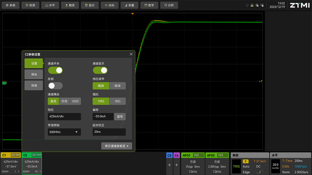 1、 根據實際的電壓探頭和電流探頭的連接情況,打開相應通道并設置探頭類型和探頭比率。