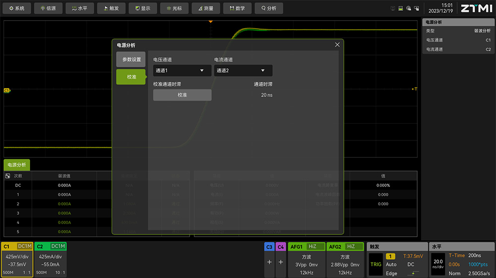 之前點擊"分析"菜單,找到**"電源分析"**功能,打開電源分析功能后,在彈出的菜單中選擇校準功能,點擊"校準"開始校準,如圖8所示,校準后波形會自動呈現在屏幕上,如圖9所示。