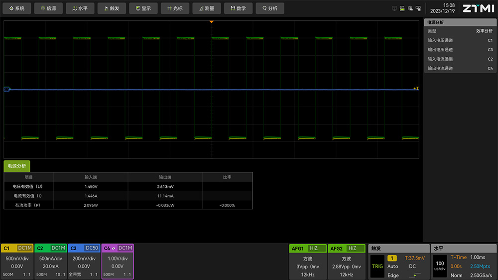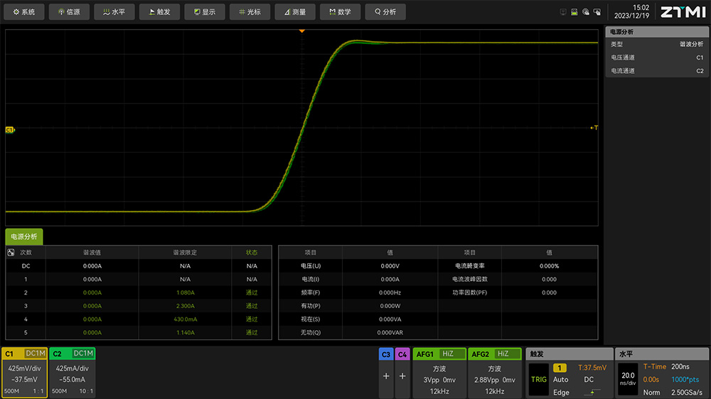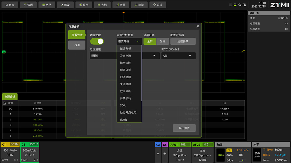 探頭傳輸延時導致的相位偏移校準完成之后,就可以正常使用ZUS6000示波器配合差分探頭和電流探頭進行無線信號的功率測試了。為了更好的實現功率測試功能,ZUS6000配備了專用的電源分析功能,如圖10所示。我們開啟效率分析功能,顯示結果如圖11所示,可以看到輸入端的電壓、電流、功率和輸出端的電壓、電流、功率,以及轉化效率參數。如果打開諧波功能,如圖12所示,可以看到各次諧波參數,并且可以看到有功功率、無功功率、視在功率等全面的功率參數。