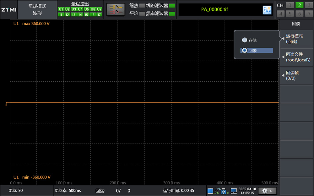 1、機器本地回讀:切換運行模式為"回讀"(圖5所示),在回讀文件中選擇保存的pad文件。文件加載后,調整"回讀幀"數即可查看不同時刻的波形狀態(圖6所示)。