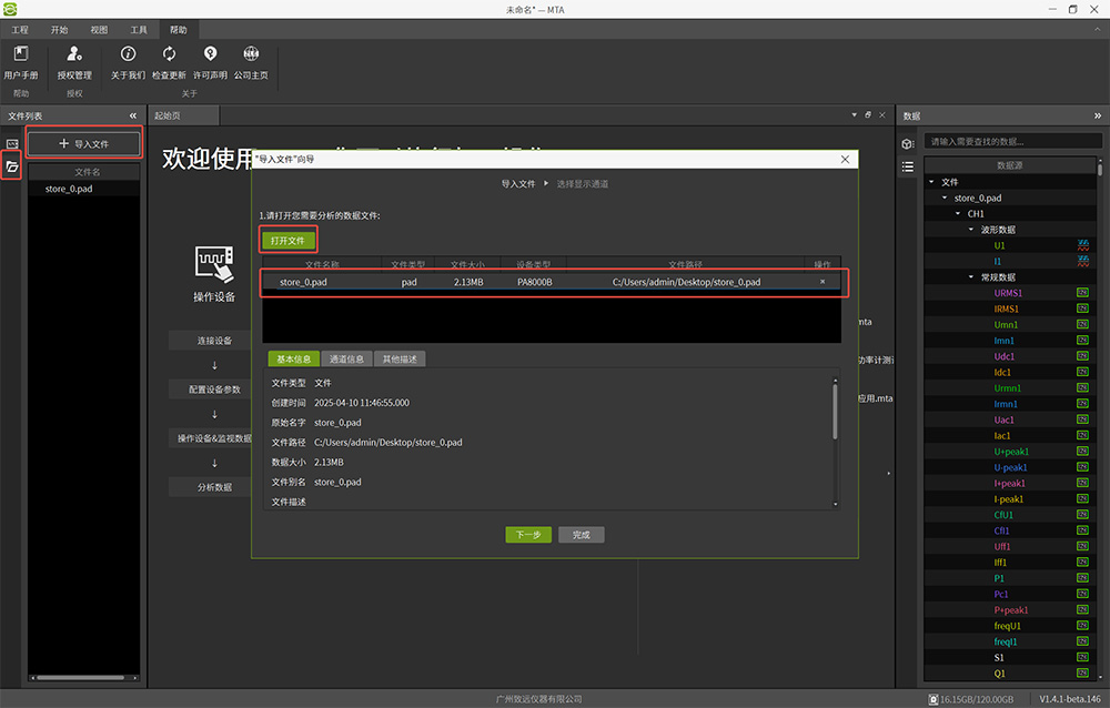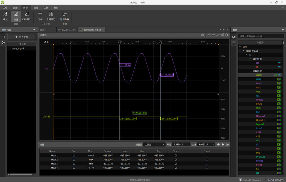 2、MTA軟件離線分析:在PC上打開MTA軟件(圖7所示),從左側欄選擇導入文件,加載保存的pad文件。文件可通過U盤拷貝到PC端,也可通過MTA軟件直接從儀器導入(圖8所示)。加載完成后,可添加光標及測量項目進行深入分析(圖9所示)。