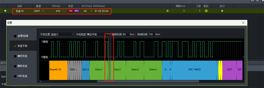 在"主動發送干擾"功能中,我們可以自定義發出報文結構、錯誤類型等,可任意模擬任意一幀報文的任意位置,如下圖,可以把將要發送的報文任意位置(即灰色選中區域)干擾為反相位,以達到發送錯誤報文的目的,從而驗證芯片在接收到錯誤報文后的動作機制。