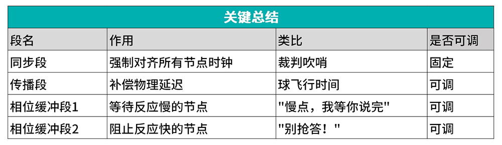 有些隊(duì)友(節(jié)點(diǎn))反應(yīng)太快,這個(gè)階段是防止他們搶跑。如果信號(hào)邊沿來(lái)得比預(yù)期早,會(huì)縮短這個(gè)段來(lái)重新同步。長(zhǎng)度可調(diào)。相當(dāng)于接球人如果提前伸手了,你就喊"別急!按節(jié)奏來(lái)!"
