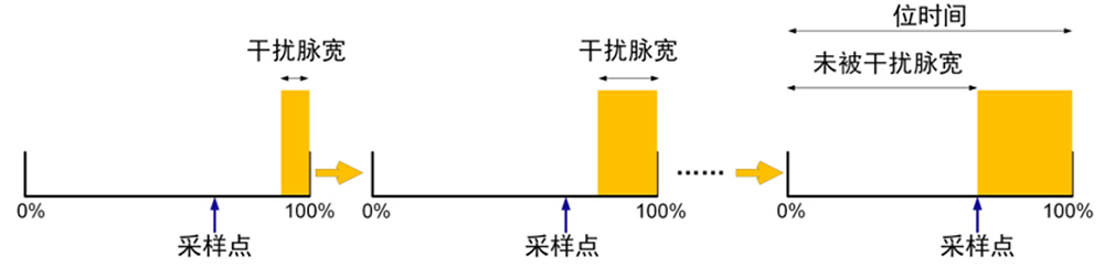 計(jì)算采樣點(diǎn):在錯(cuò)誤幀波形中,找到被干擾的位。測(cè)量該位未被干擾部分的脈寬(T_unaffected),除以整個(gè)位時(shí)間(T_bit),即可得到采樣點(diǎn)位置: