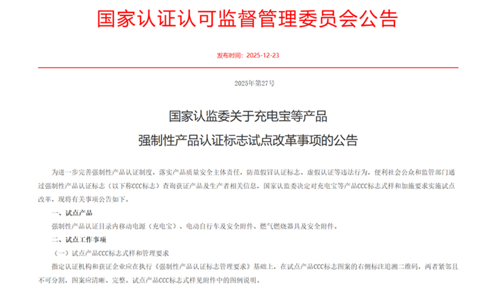 根據(jù)相關(guān)政策,2026年3月起,充電寶、電動(dòng)自行車(chē)等涉及公共安全的品類須加施CCC追溯二維碼。由于這兩類產(chǎn)品均以鋰離子電池為核心,其安全性與合規(guī)性至關(guān)重要。